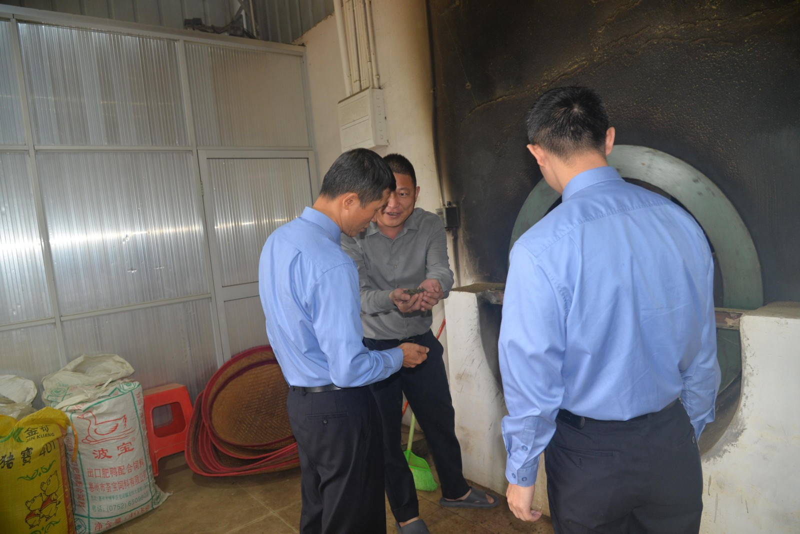 检察官在马图茶业有限公司总经理何运新的带领下,参观了该公司的茶叶生产车间,听取了马图绿茶制作技艺非遗传承人何运新关于茶叶采摘、杀青、揉捻、烘干、复火等制作过程的介绍。