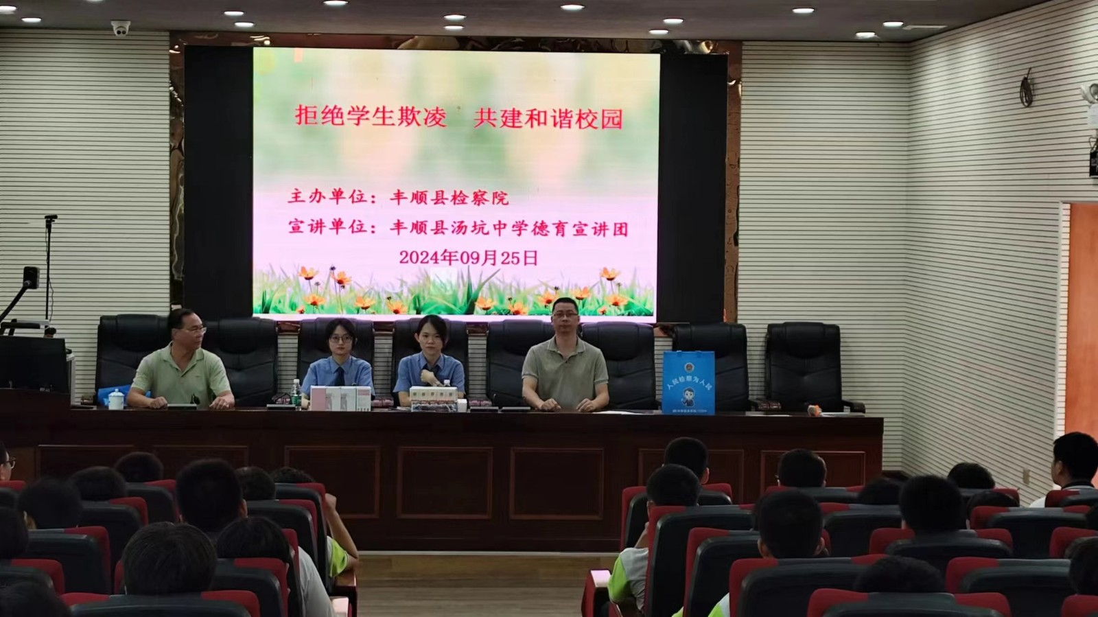 针对未成年人自制力和自我保护能力较差的情况,9月25日,丰顺县检察院未检办与汤坑中学联合开展中学生专项普法教育活动,并邀请丰顺县法治宣讲员、汤坑中学宣讲团成员陈学军担任主讲人,为学生们带来一堂特殊的普法课。