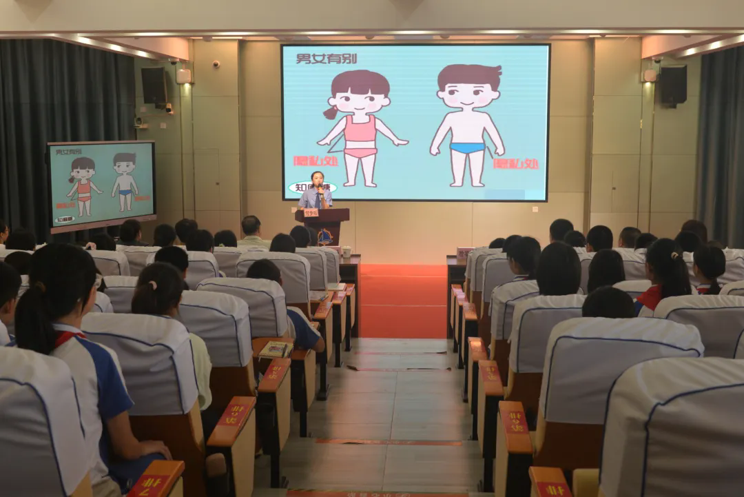 启动仪式结束后,未成年人检察办公室负责人何梦瑶为学生上了一堂以“预防性侵害,检爱护成长”为主题的法治教育课,课堂结合未成年人的身心发展特点分为上下两节,第一节收听收看对象为全县中小学全体师生,第二节仅面向全县中小学五年级以上师生。