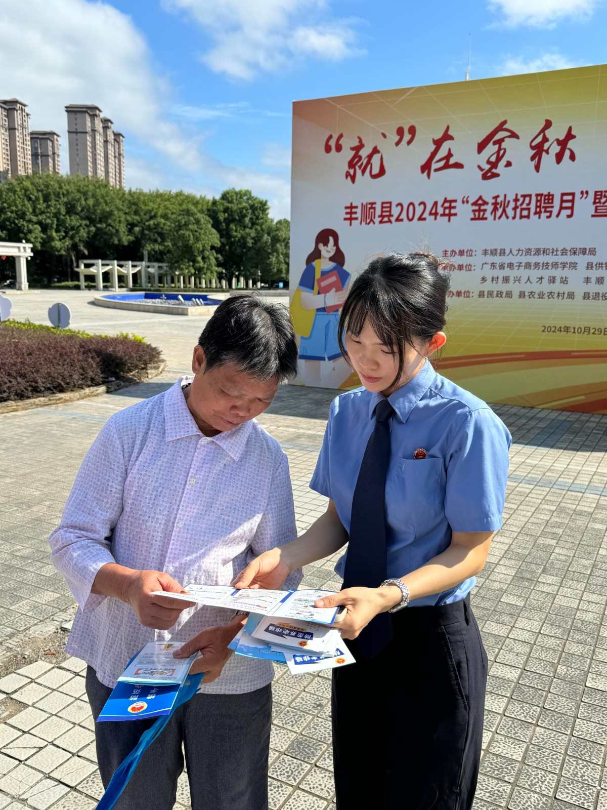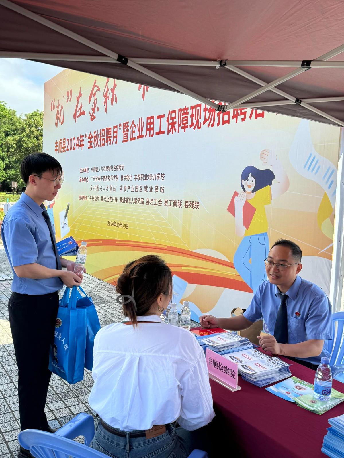 “就”在金秋,“职”面未来。10月29日,丰顺县2024年“金秋招聘月”暨企业用工保障现场招聘活动在县城新世纪广场举办。为深入开展“检察护企”专项行动,丰顺县检察院组织干警在招聘现场为企业和求职者提供面对面普法和法律咨询。