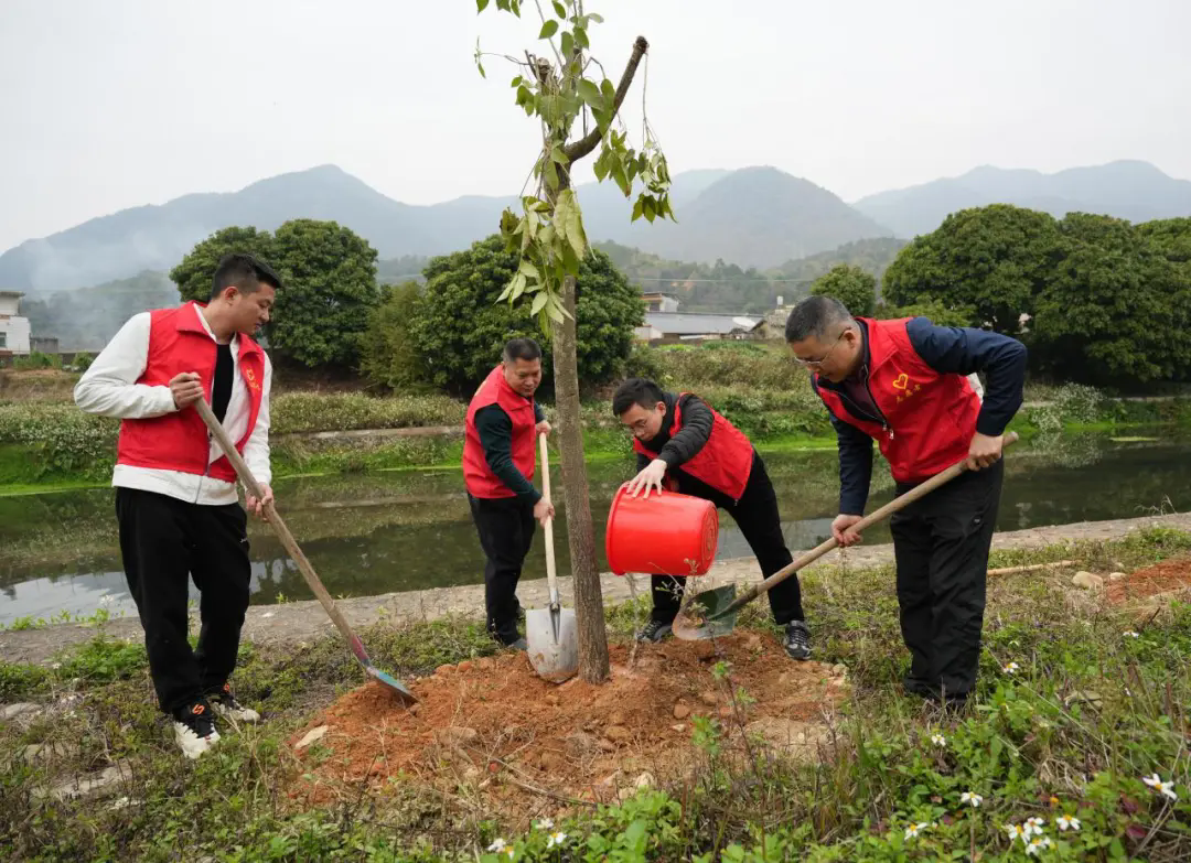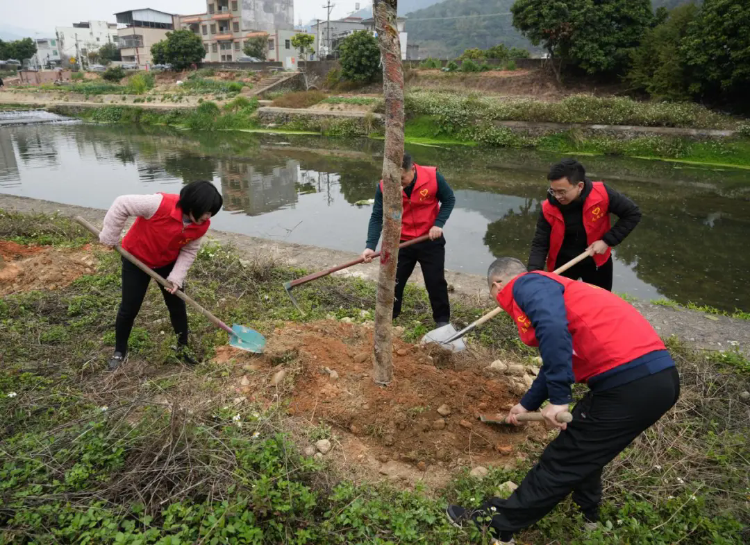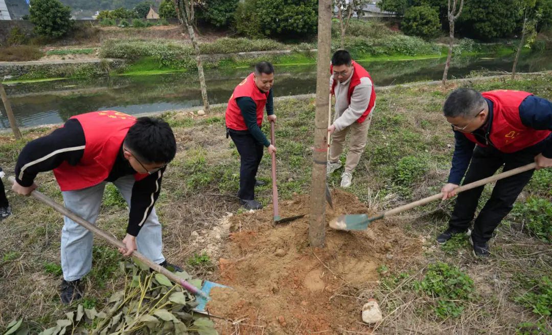 党员干警身披志愿者红马甲,驱车来到离县城40多公里的建桥镇环中村,与当地党员干部一起到小溪边的河岸上植树造林。党员们分工有序,密切配合,挥锄挖坑、扛树撕膜、扶树填土、夯实土基、提水浇灌,经过一番辛勤劳作,几十棵红花风铃木、宫粉紫荆树迎风挺立,为小山村增添了一道靓丽的风景线。